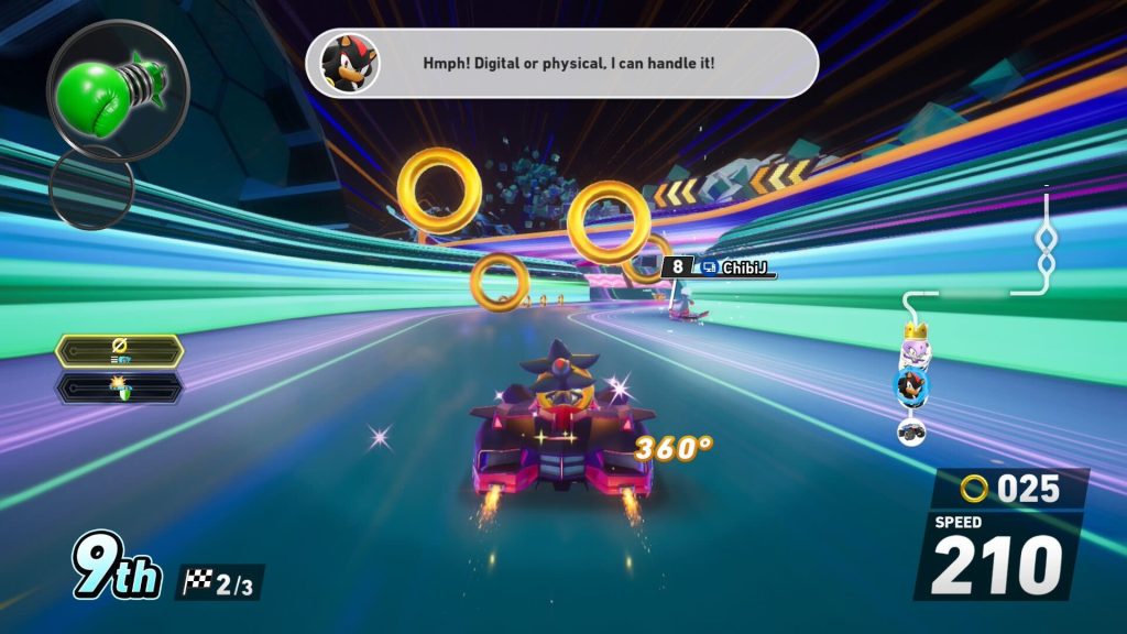 First off, Sonic Racing CrossWorlds on Nintendo Switch 2 is fully on cartridge. In addition, the biggest draws for the Switch 2 version of CrossWorlds, 1440p resolution in Docked mode and 1080p resolution in Handheld mode, really make you feel like you’re playing a totally different game compared to the Switch version. Both Docked and Handheld achieve a locked 60 fps. This is a massive step up from the performance of the base Nintendo Switch version of the game, the only version of the game that was available at launch for either Switch system. As I noted in my original review, I actually found the original Switch version, with it retaining most of the major particle effects, fairly impressive despite being majorly held back by the aging hardware’s limitations. It’s fantastic to have an actual Switch 2 version of the game that was made with the significantly better capabilities of the new console in mind.