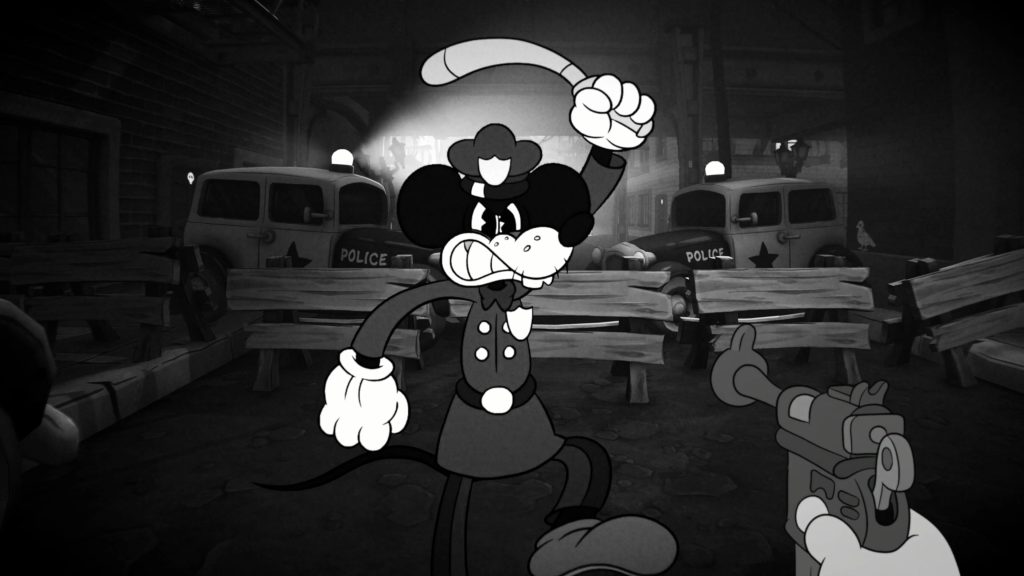 Mouse: P.I. For Hire begins with a magician’s disappearing act and the murder of his assistant. What it becomes is so much more than that, tackling themes of corruption, oppression, political intrigue, trafficking, drug and alcohol addiction and more. Surprisingly, for a game about cartoon mice, the plot does not feel heavy-handed. Instead, the gritty noir that unfolds contrasts well with the bouncy, whimsical animation style. In keeping with the 1930s time period, the game is rendered in black and white which only adds to the Casablanca of it all. Even the blood is rendered in black and white! Given this is a detective story, you can expect to hear lots of saxophone and big band swing. It’s also a big adventure so some recognizable public domain Classical compositions are tastefully added in there too. At one point, I pointed out Dies Irae being used which was a fun detail. What’s more, the sound and visuals can be tweaked to sound muffled as if being played on a phonograph or appear grainy like film. Mouse is not interested in simply looking the part. It talks the talk and walks the walk when it comes to being a narrative boomer shooter based on classic film noirs while looking and sounding like a 1930s cartoon.